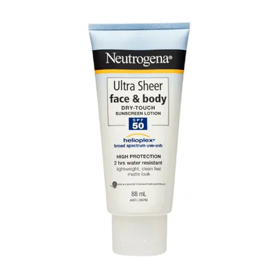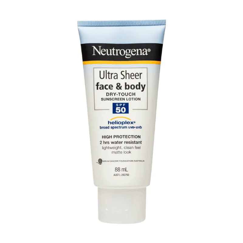 NEUTROGENA® Ultra Sheer Face SPF50 Sunscreen Liquid-Lotion provides very high sun protection stabilised with HELIOPLEX® technology. It provides balanced broad-spectrum UVA/UVB protection against skin-aging UVA and burning UVB rays in a water light formula. This lightweight liquid lotion is oil free and non comedogenic leaving your face free from that thick and greasy sunscreen feeling leaving a weightless, non-shiny finish so skin can breathe.
